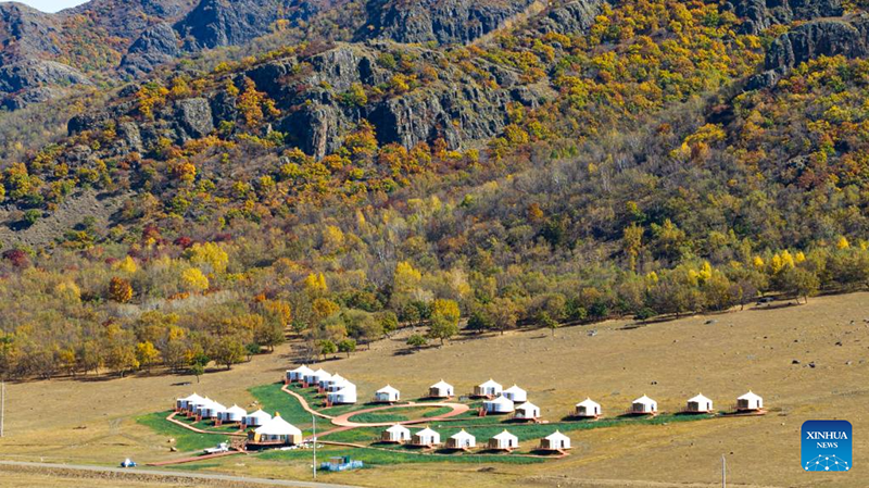 An aerial drone photo taken on Sept. 28, 2025 shows a resort at a scenic area in Horqin Right Wing Front Banner, Hinggan League, north China's Inner Mongolia Autonomous Region. (Xinhua/Bei He)