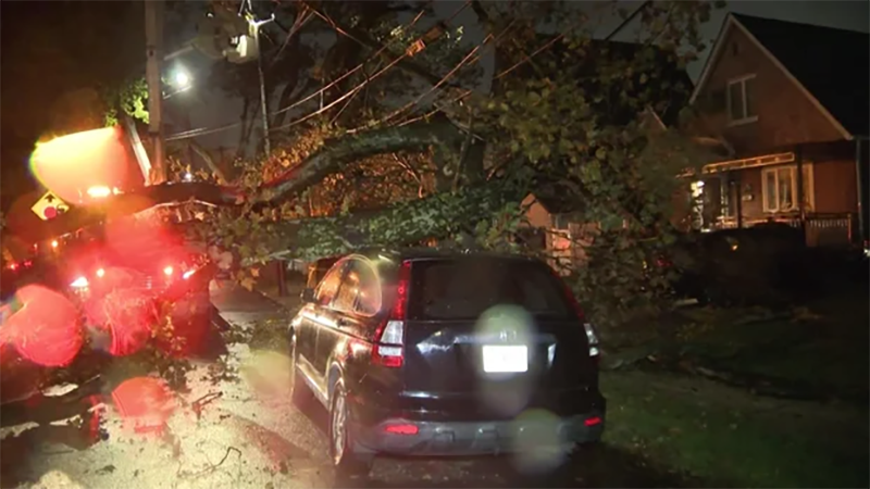 Strong winds brought a tree crashing down onto a car in Queens on Oct. 12, 2025. CBS News New York