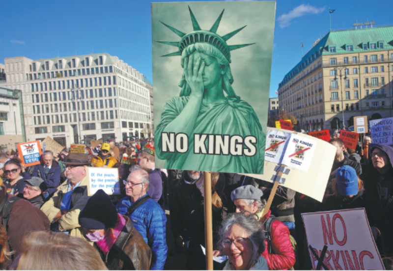 A woman displays a "No Kings" sign during a protest outside the US embassy in Berlin on Saturday. MARKUS SCHREIBER/AP