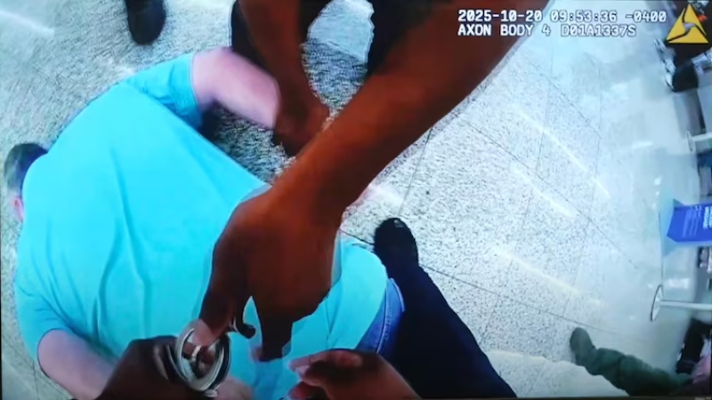 Police body camera footage of an arrest at the Hartsfield-Jackson Atlanta International Airport is shown during a press briefing, Oct. 20, 2025. Atlanta Police Department