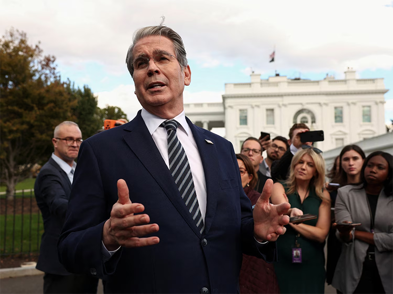 Treasury Secretary Scott Bessent speaks with reporters outside the West Wing of the White House in Washington, October 22, 2025. Kevin Lamarque/Reuters