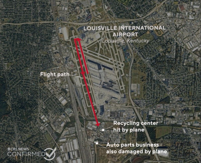 A map shows the path taken by a UPS plane before it crashed in Louisville, Kentucky, Nov. 4, 2025. CBS News; flight path from Flightradar24