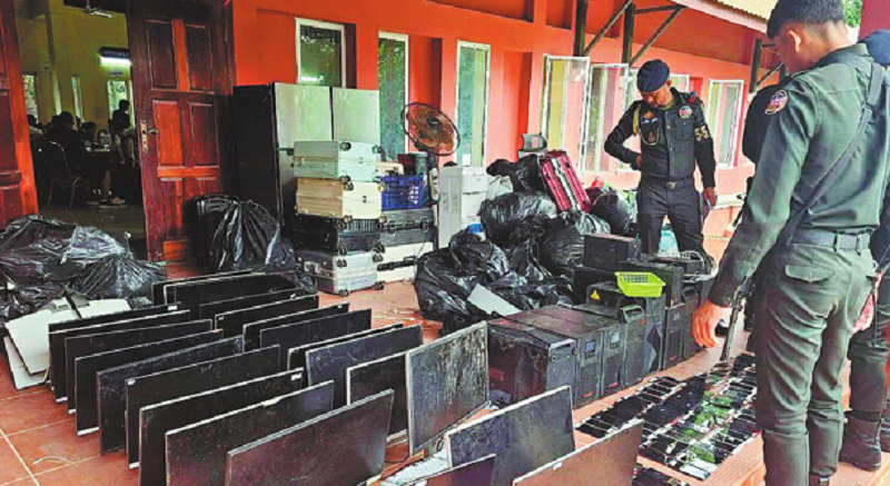 Military policemen look at computers, smartphones and other equipment seized during a raid on a scam center in Kandal Province, Cambodia, on July 17. AFP