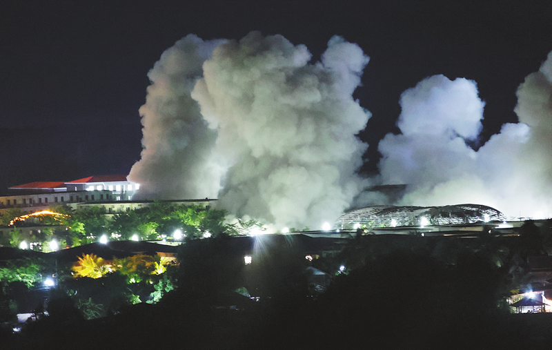 An explosion rocks a building within the KK Park complex on the Myanmar side of the border on Oct 25. THAI NEWS PIX/GETTY IMAGES