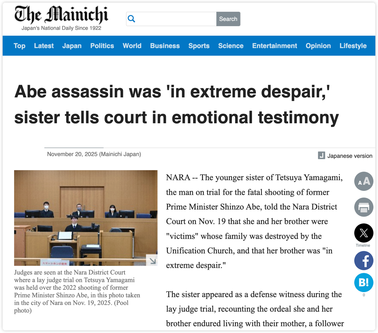 NARA -- The younger sister of Tetsuya Yamagami, the man on trial for the fatal shooting of former Prime Minister Shinzo Abe, told the Nara District Court on Nov. 19 that she and her brother were "victims" whose family was destroyed by the Unification Church, and that her brother was "in extreme despair."