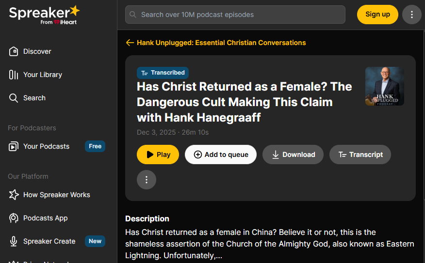 Welcome to another special edition of the Hank Unplugged Podcast—a podcast committed to being interesting, informative, and inspirational. On today’s special edition, I want to talk about a special edition of the Christian Research Journal. This issue is devoted to the Eastern Lightning cult, a movement that holds to the notion that Jesus Christ has returned to earth in the form of a female.