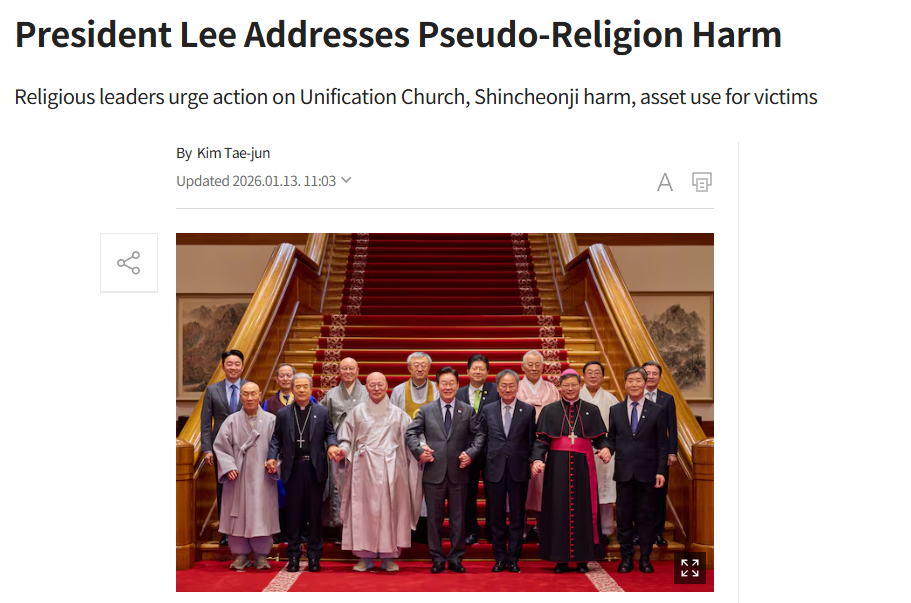 In response, President Lee expressed agreement, stating, “This is a truly difficult subject, but the harm to our society has been neglected for too long, leading to enormous damage,” Kang relayed. The attending religious leaders then requested, “Dissolving religious groups that harm the nation and its people would likely gain public consensus,” and added, “We ask the government to consider using the assets of problematic religious foundations to support victims of pseudo-religions.”