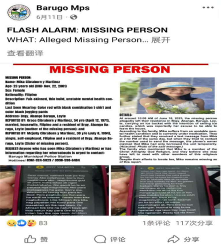 The post quickly went viral across Philippine social media. Meanwhile, Mika’s elder sister Mcjolly and mother Grace Cibraborn y Martinez reported her missing to the police. The Barugo PMS issued an official missing-person notice. According to the notice, Mika was born on November 22, 2001. Around 10 a.m. of June 10, 2025, she left home under the pretext of selling ice pops. The notice quoted family members saying Mika was member of the cult Church of Almighty God and had run away after being manipulated by the group.