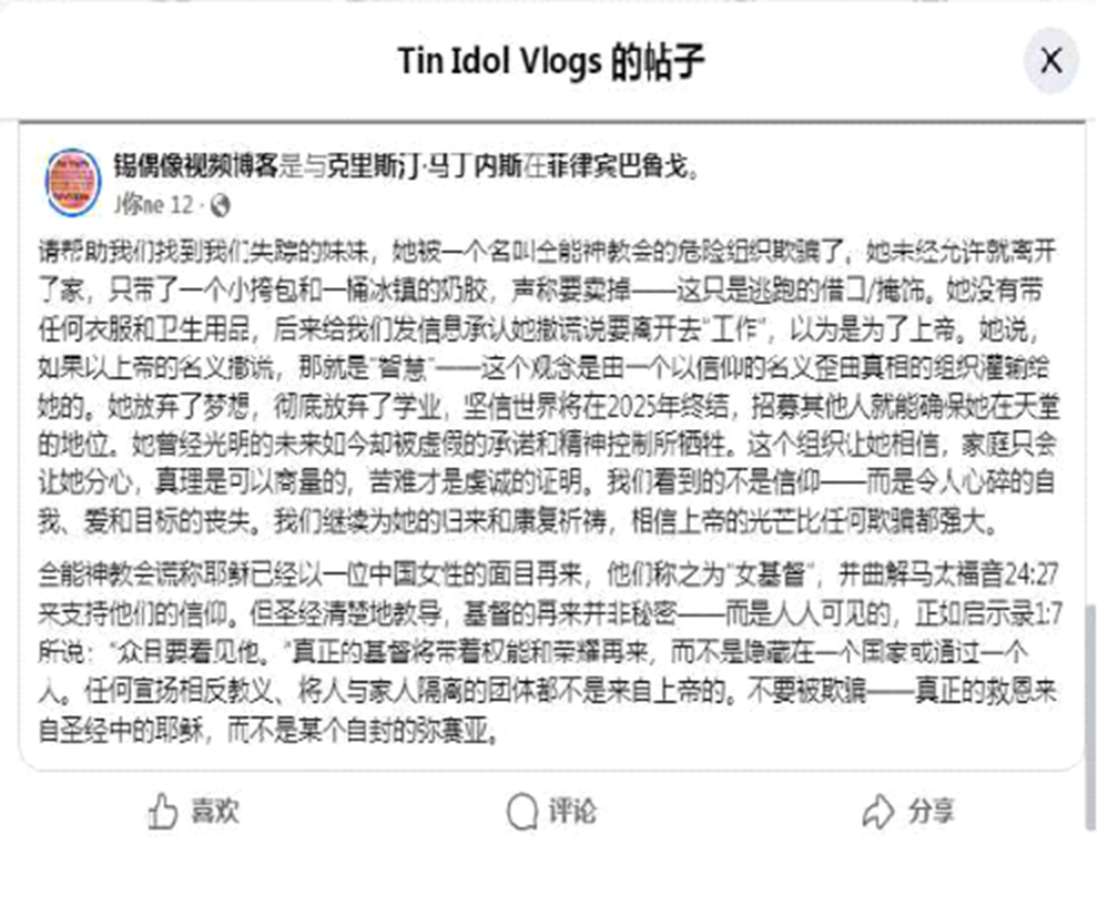 On June 12 this year, Filipino netizen Tin used her “Tin Idol Vlogs” account to post a missing-person appeal in the Facebook group “Philippine News,” asking the public to help find Mika. The post wrote that Mika had been brainwashed by members of the cult Church of Almighty God, dropped out of school, and ran away from home. She had been told she must “sacrifice her family to secure a seat in heaven” and that believe the world would end in 2025.