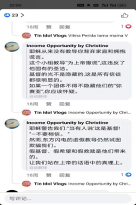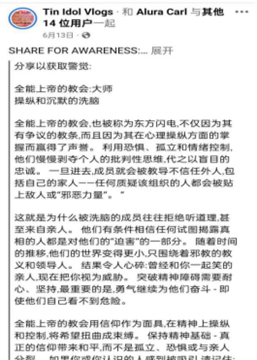 ▲Facebook account “Tin Idol Vlogs” reposted an introduction to the cult Church of Almighty God on June 13 (Original English, machine-translated into Chinese)